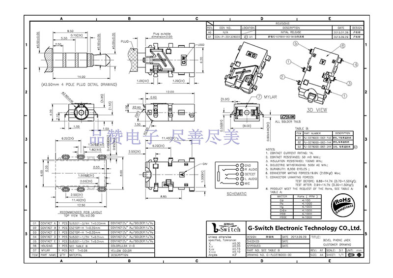 产品性能:四级6PIN 沉板2.15贴片耳机插座