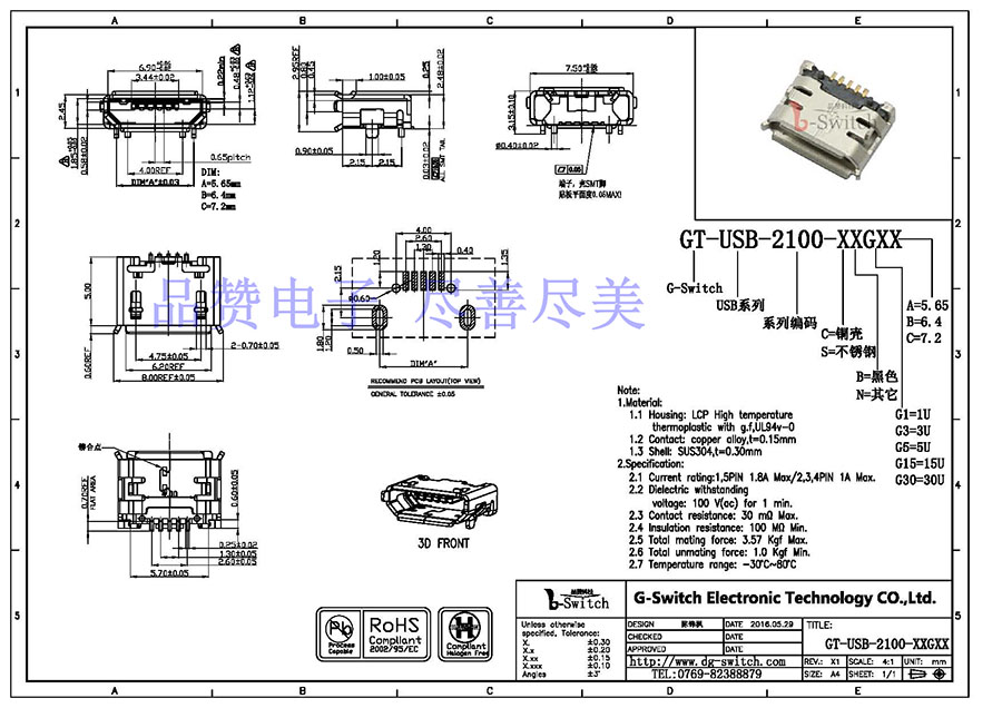 G-Switch 东莞品赞电子科技有限公司 www.dg-switch.com 主要生产:MICRO USB母座、防水USB母座、牛角型MICRO USB母座、MICRO USB带钢片、7.2/6.6 牛角型 MICRO USB母座、前插后贴MCIRO USB母座、全贴型USB母座、7.2/4.85 MICRO USB母座、MICRO USB CONN. |
