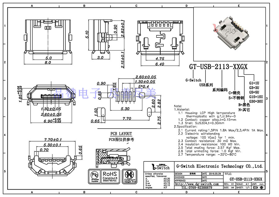 G-Switch 东莞品赞电子科技有限公司 www.dg-switch.com 主要生产:MICRO USB母座、防水USB母座、牛角型MICRO USB母座、MICRO USB带钢片、7.2/6.6 牛角型 MICRO USB母座、前插后贴MCIRO USB母座、全贴型USB母座、7.2/4.85 MICRO USB母座、MICRO USB CONN. |