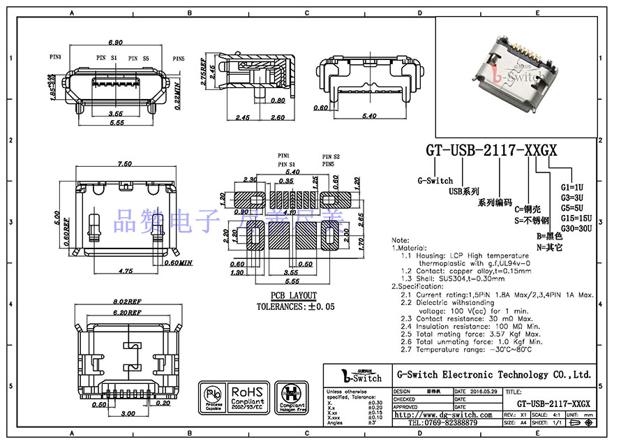 G-Switch 东莞品赞电子科技有限公司 www.dg-switch.com 主要生产:MICRO USB母座、防水USB母座、牛角型MICRO USB母座、MICRO USB带钢片、7.2/6.6 牛角型 MICRO USB母座、前插后贴MCIRO USB母座、全贴型USB母座、7.2/4.85 MICRO USB母座、MICRO USB CONN. |