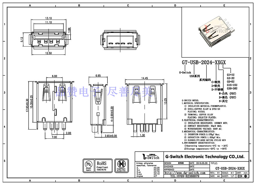| Designation 品名: | USB AF 长体焊线式 有边 | ||||