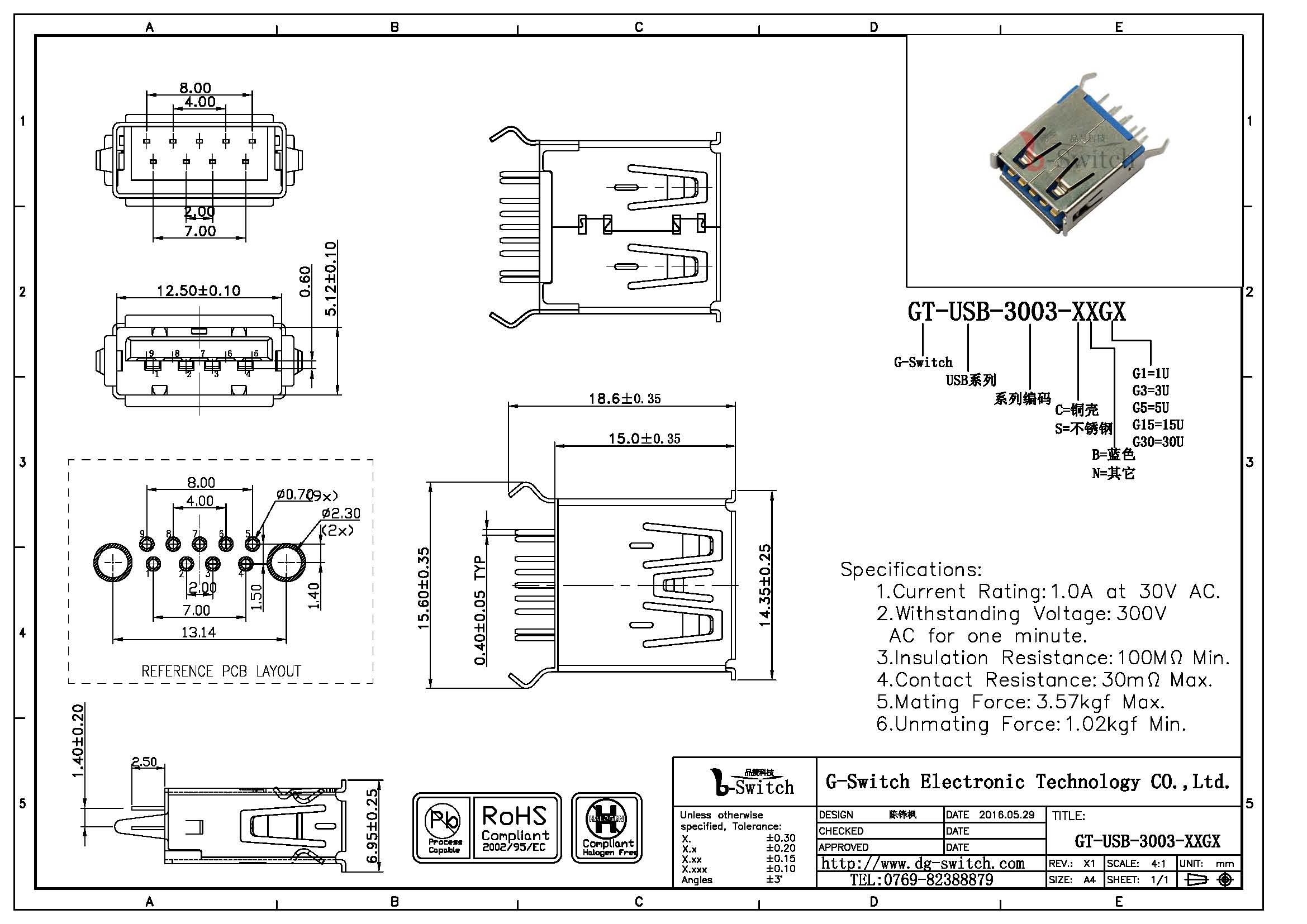产品名称:USB3.0 AF 15.0 180度 弯脚有边