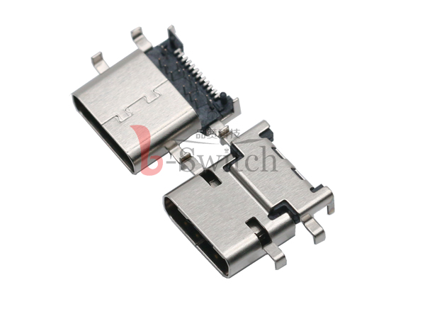 前插后贴TYPE-C 24PIN母座 外壳长度有:10.0和8.65mm两款,脚型有四脚插拔和前贴后插款,可供选择。