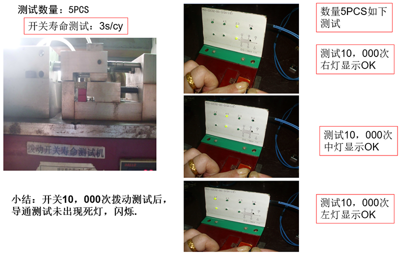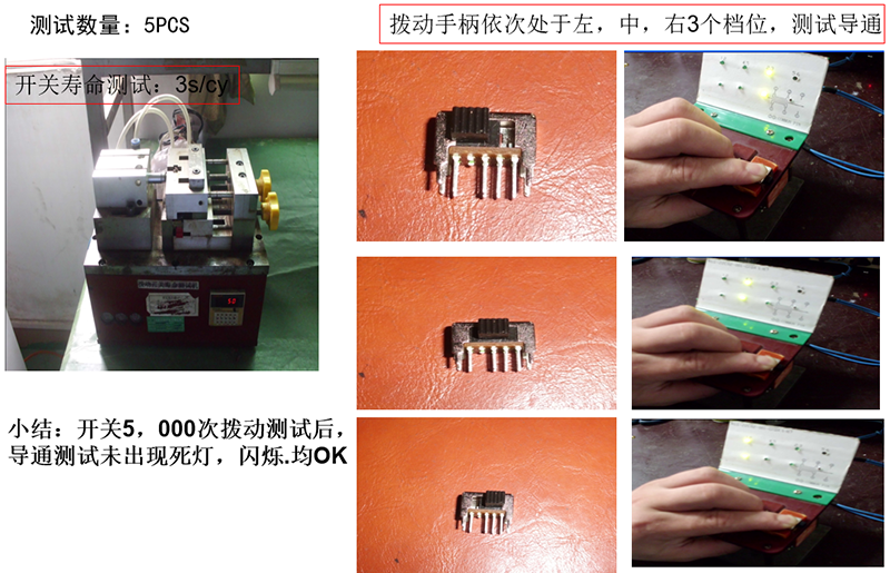 三.拨动开关拨动开关5,000次;(测试导通及动作部件解剖图)