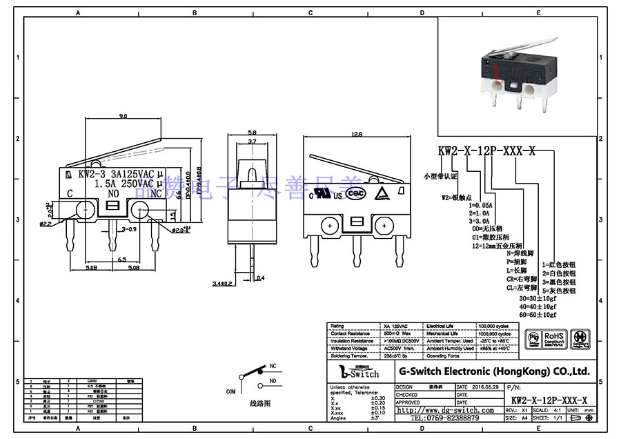 2. Appearance, Structure and Dimensions 外观,结构及尺寸: 2.1 Appearance: The switch shall have good finishing, and no rust, crack or plating defects. 外观: 产品外观良好,无锈蚀、裂纹和镀层缺陷。 2.2 Structure & Dimensions: Refer to individual product drawing. 结构及尺寸: 参见产品图纸 2.3 Markings: Refer to individual product drawing. 标识: 参见产品图纸。 |