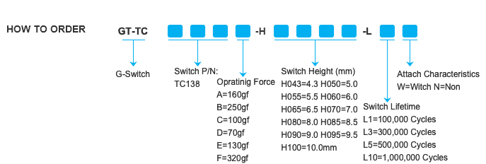 两脚轻触开关6×6,动作力:70、100、130、160、250、320、400gf;寿命10、30、50、100万次。
