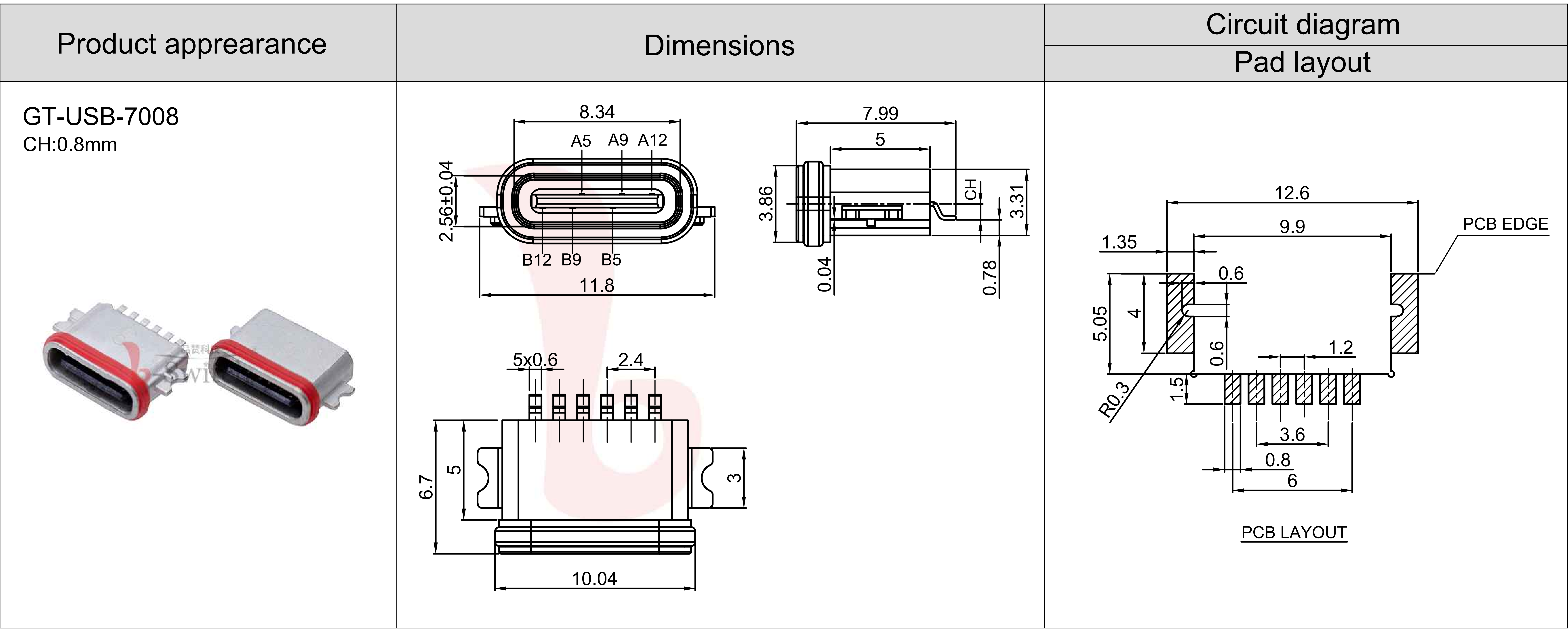 6pin,沉板0.8 CH0.8mm,L6.7mm 侧压防水IPX7,电流5A |