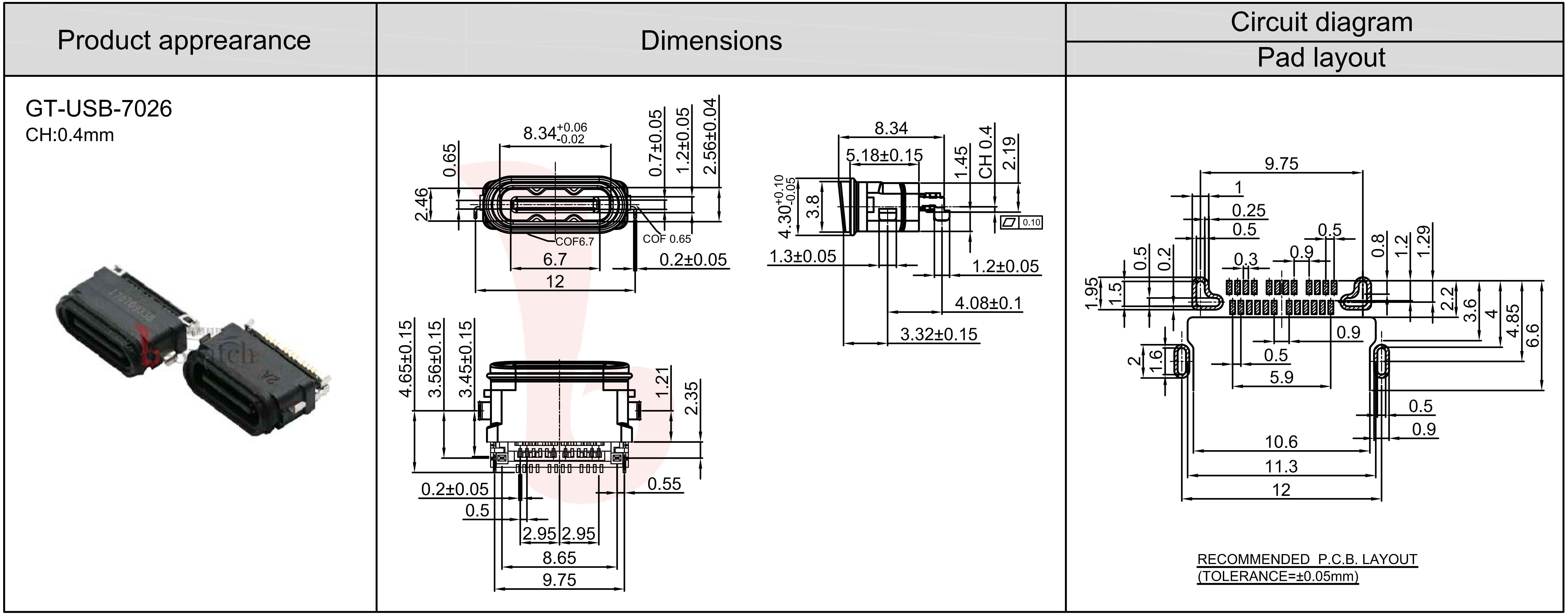 24pin,斜口沉板1.45mm,CH0.4 L8.34mm,防水IPX8戴防水圈,40Gbp/s |