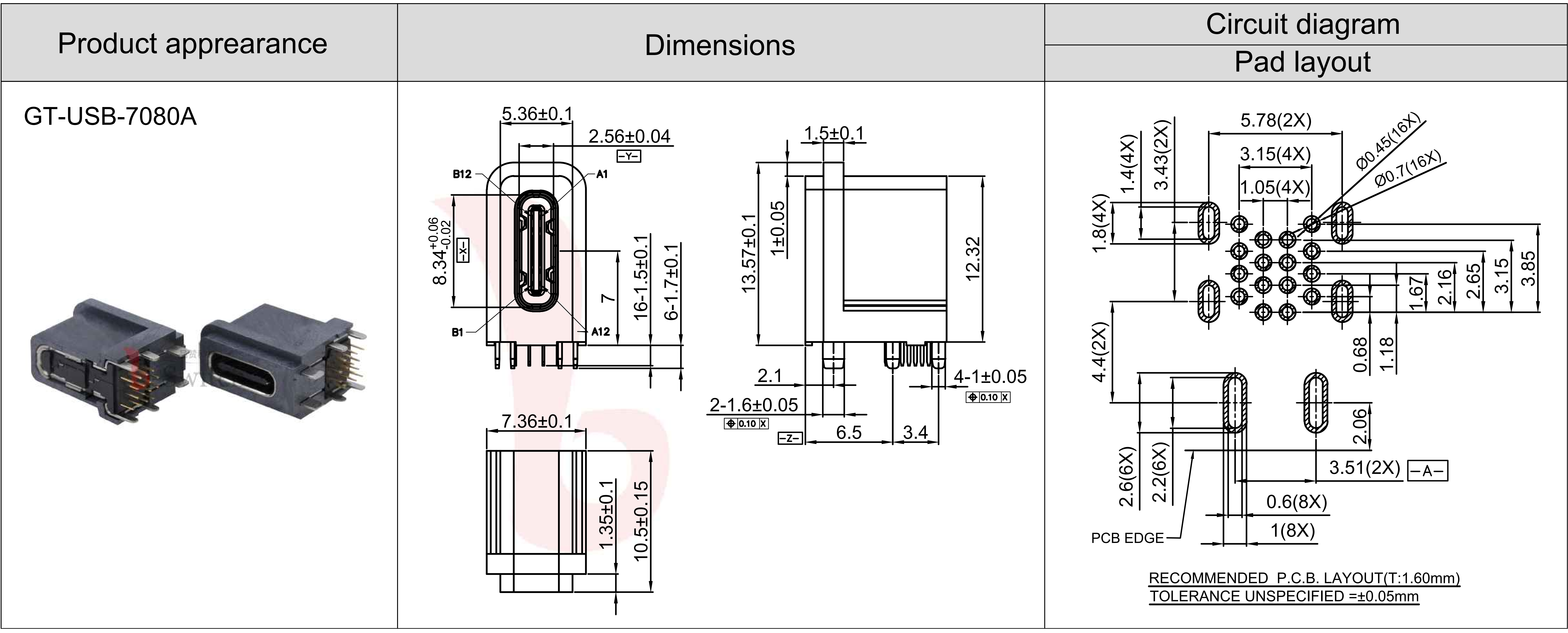 侧立式防水16Pin Type C母座:侧插CH=7.0mm;L=10.5mm;防水IPX6;5A。