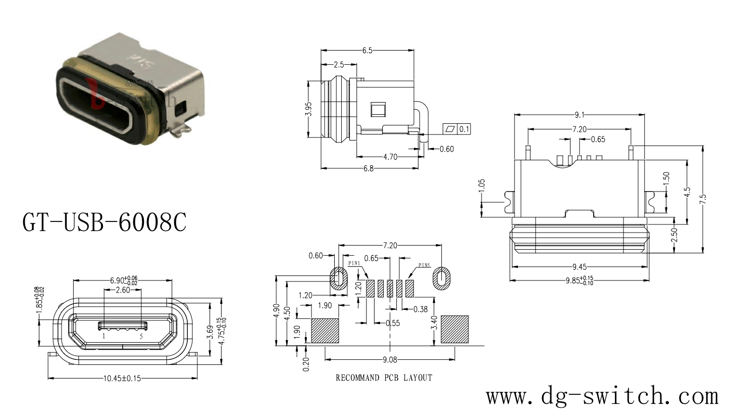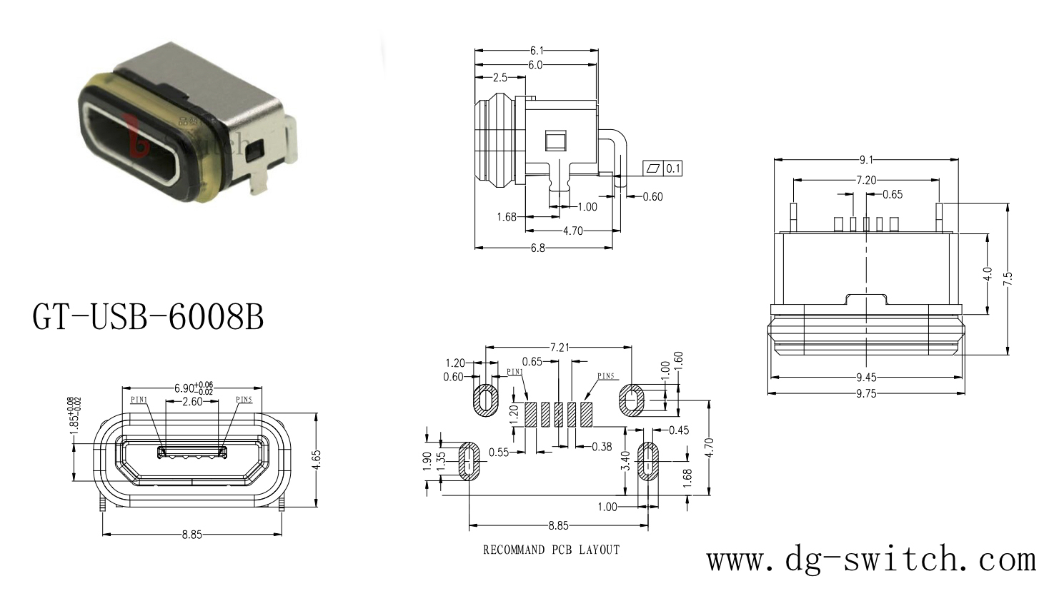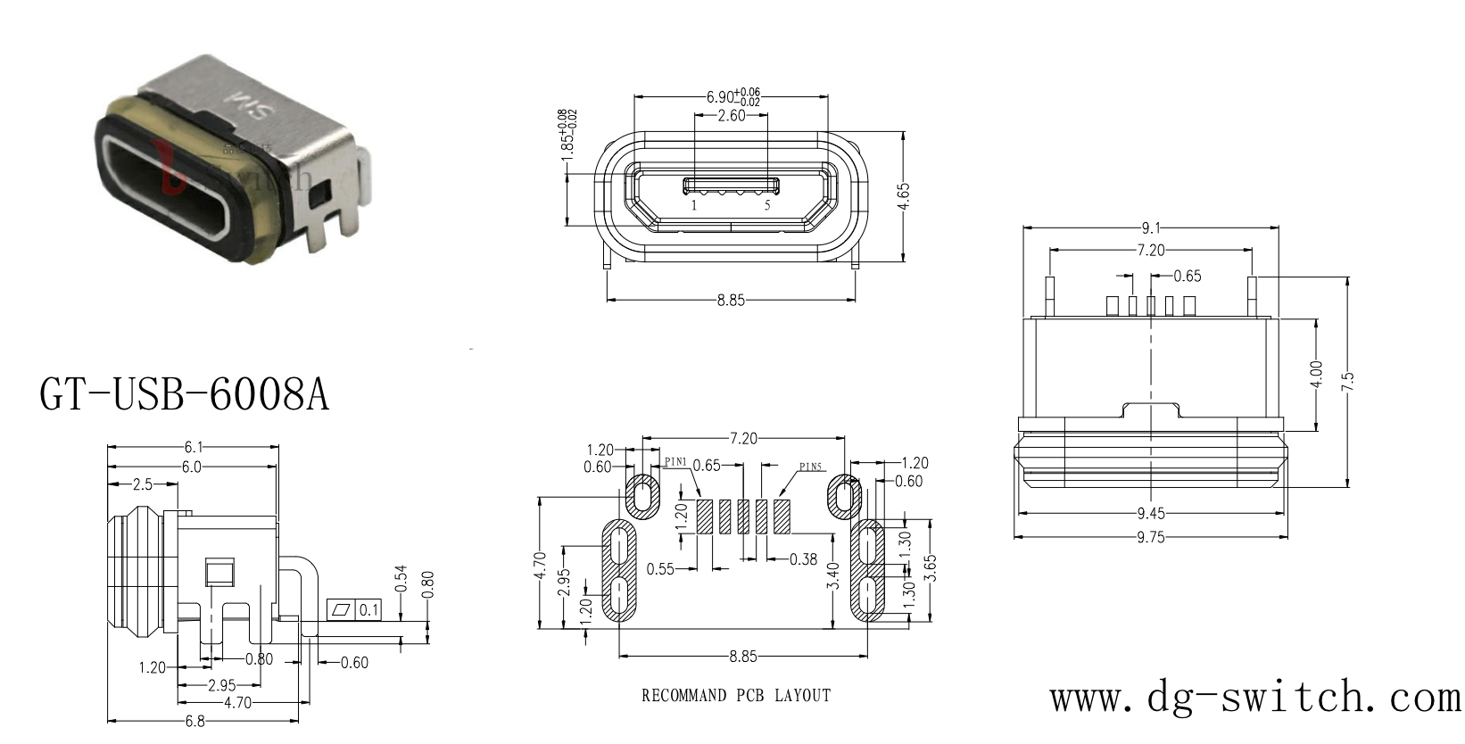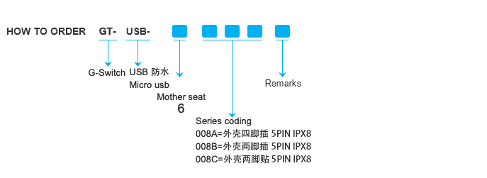 板上型带外壳防水IPX8 MICRO USB母座,外壳有:四脚插板、两脚插板、两脚贴片三款脚型可选。