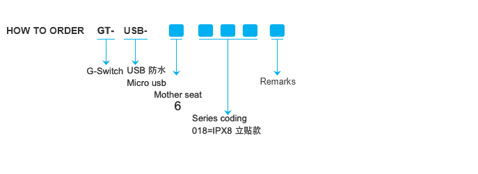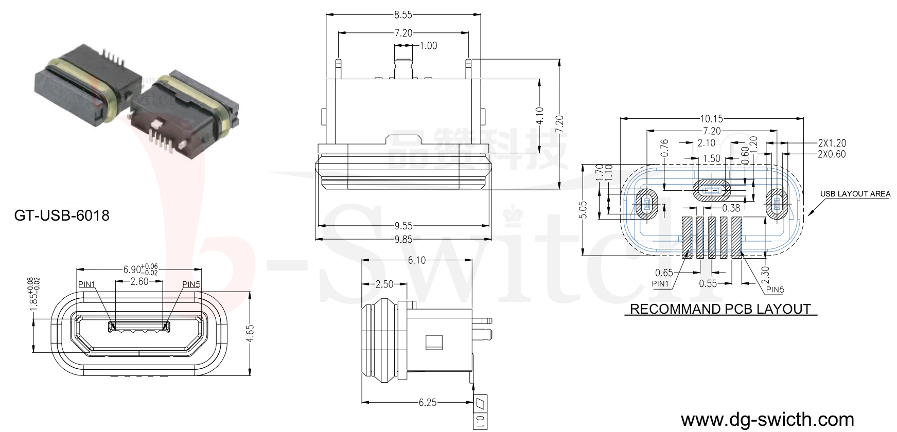 立贴防水MICRO USB 5P母座,防水等级IPX7,立板高度6.1mm。