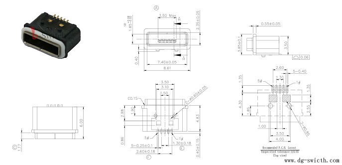 MICRO USB 5PIN母座 全贴带柱 防水等级IP67。