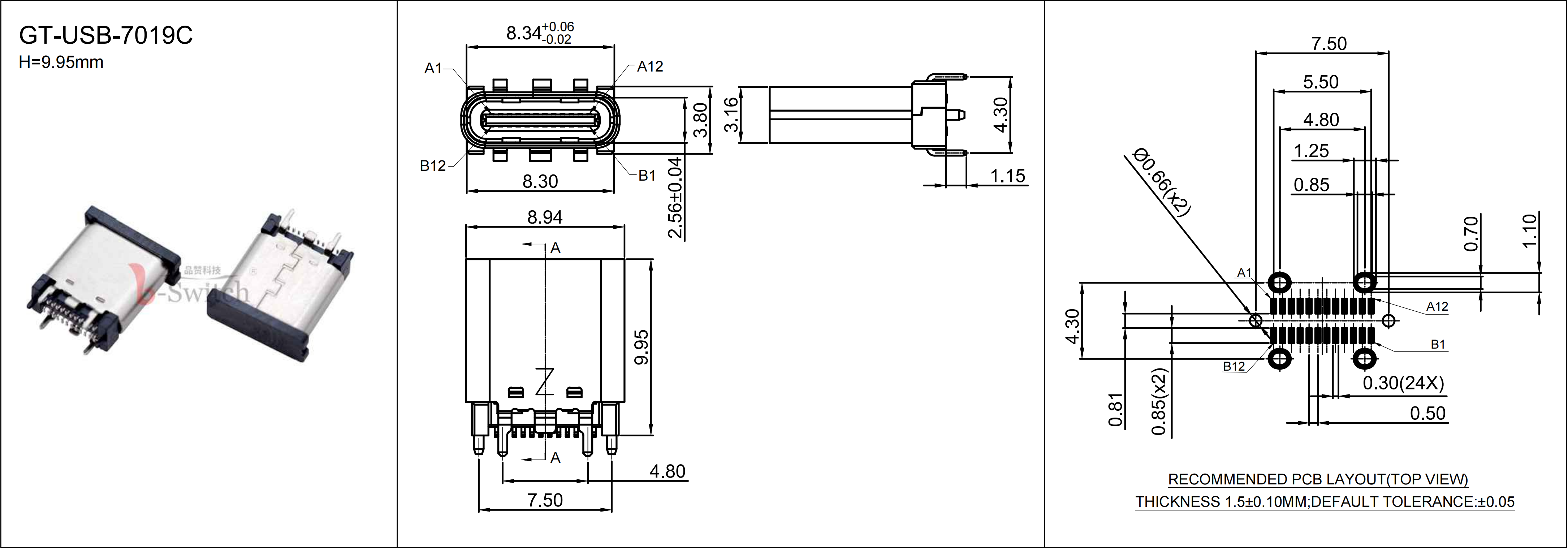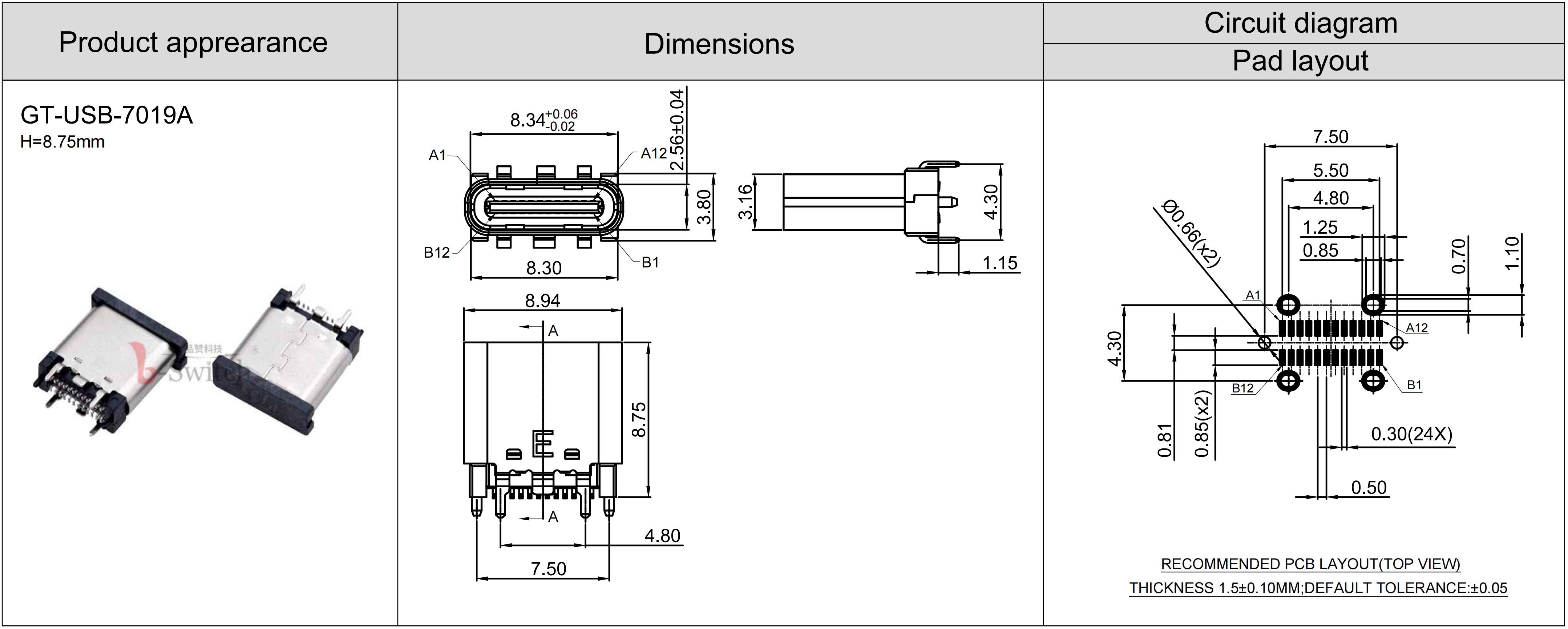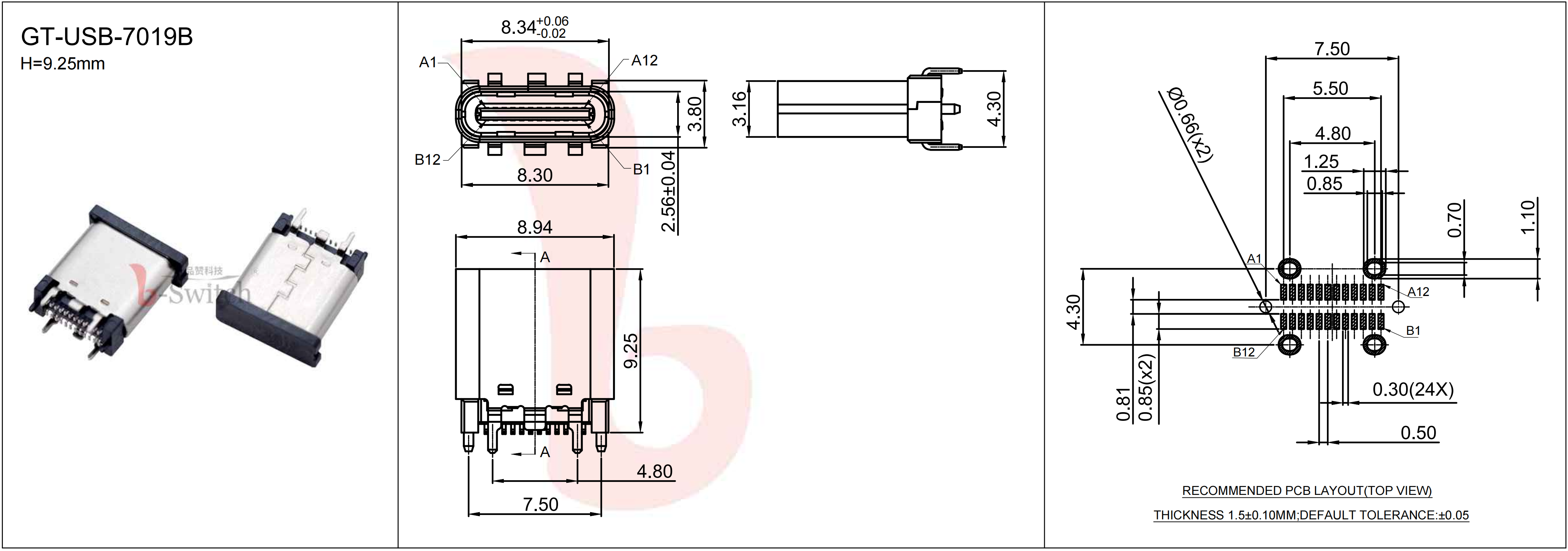USB4.0立贴Type C 24pin母座:H=8.75/9.25/10.0/10.4mm;高频40Gbp/s;5A电流。