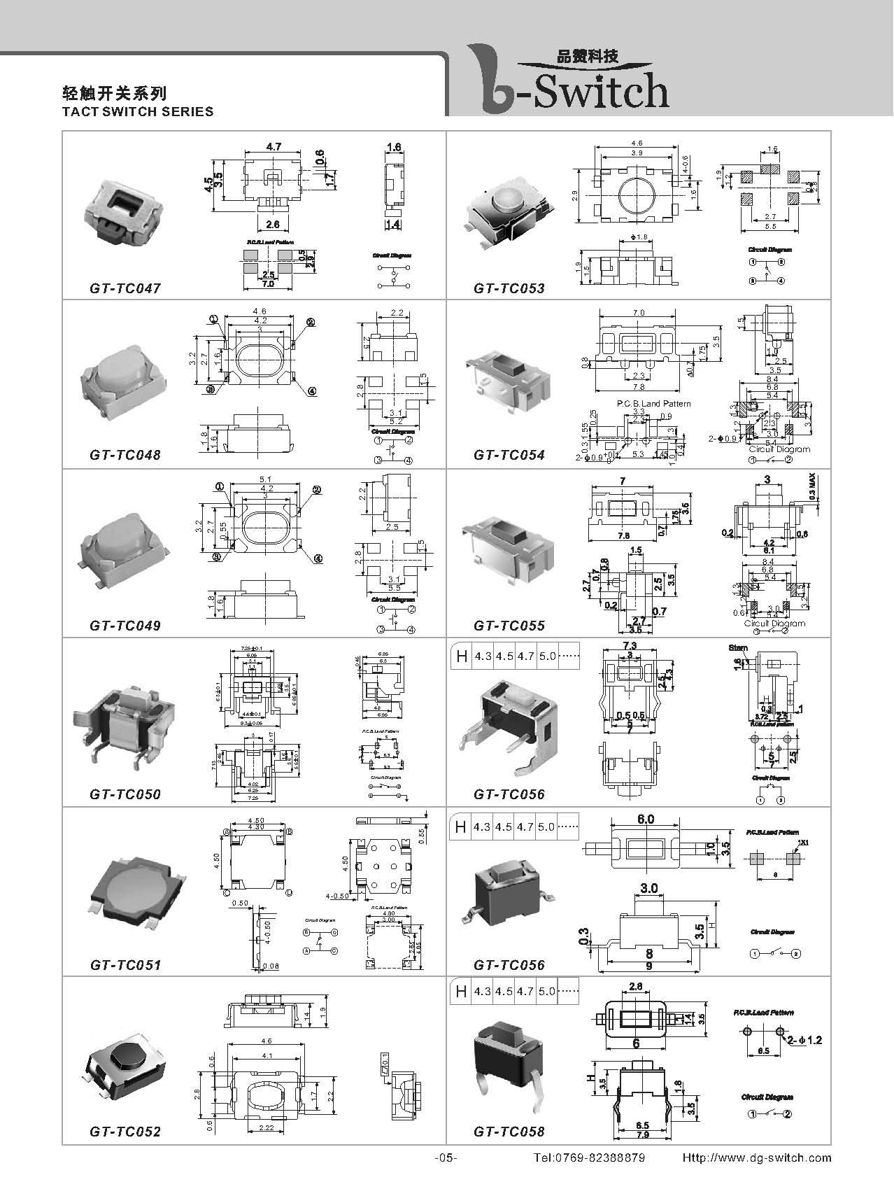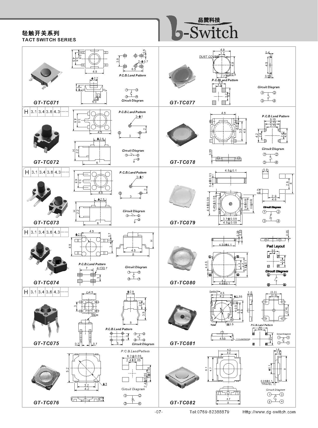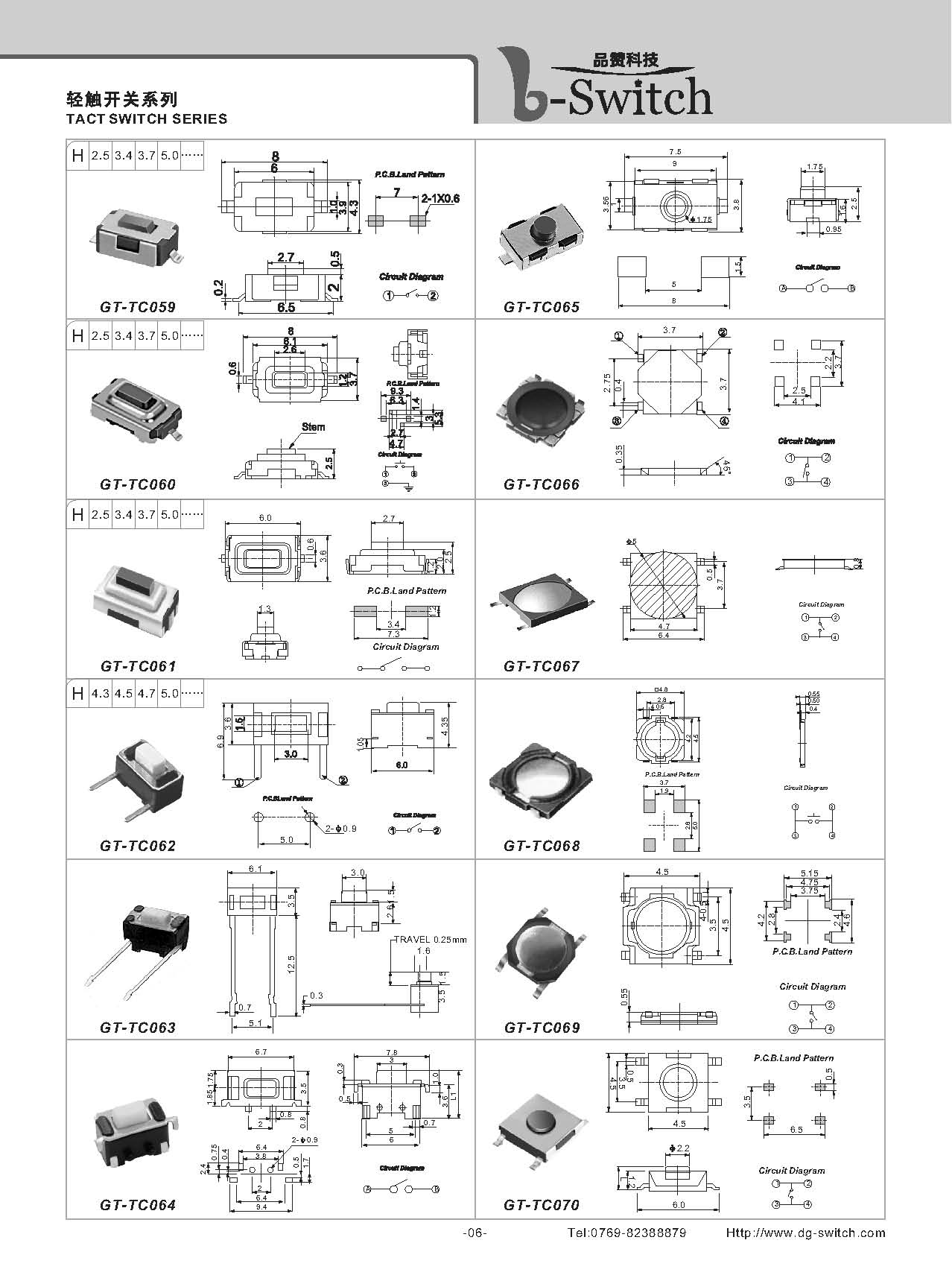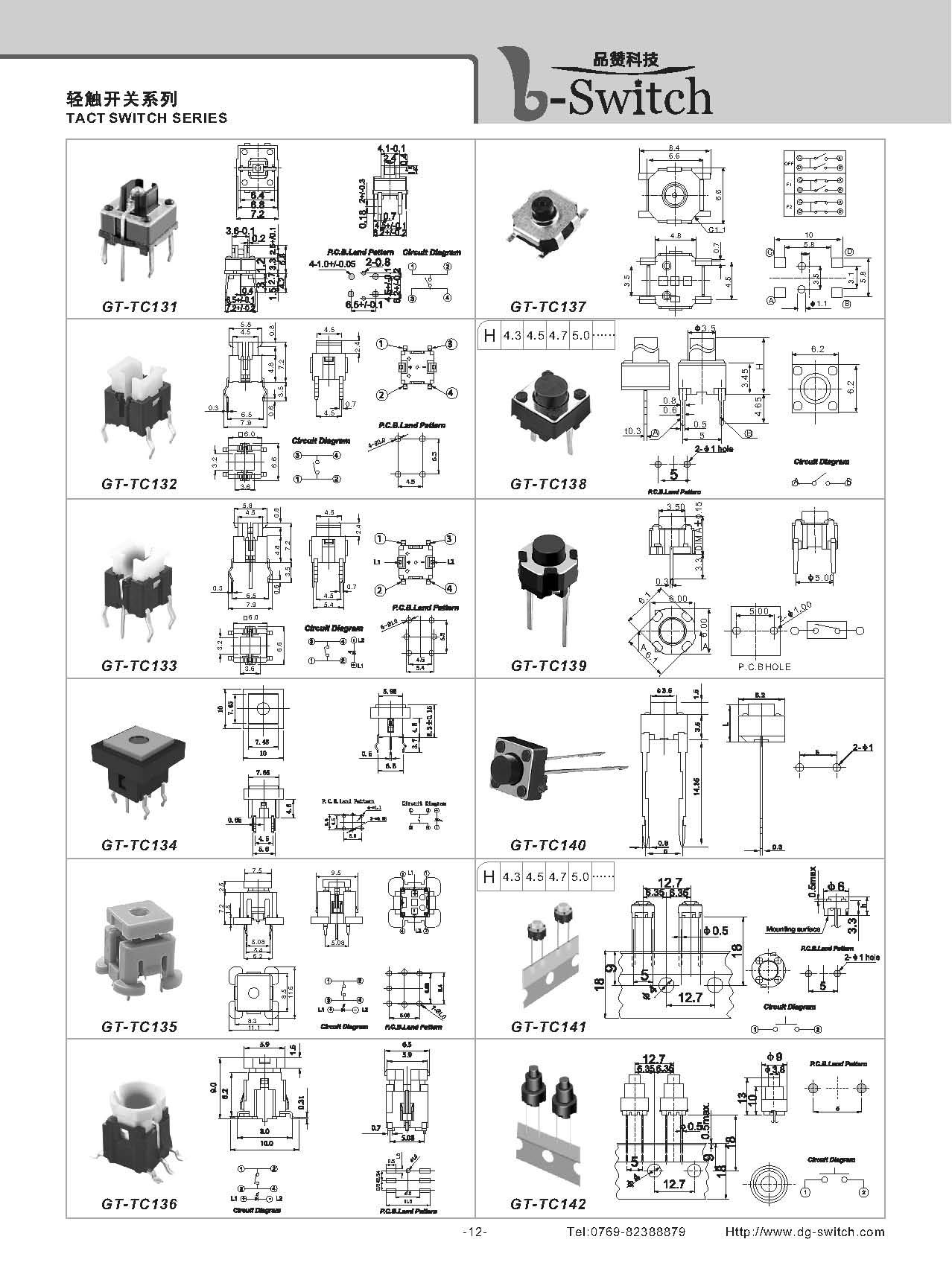 规格分类:轻触规格有:插件式、贴片式、侧按、沉板、防尘防水、带灯、带支架、乌龟型侧按。插件式的规格有:插件式3*6系列、插件式4.5*4.5系列、插件式6*6系列、插件式6.2*6.2系列、插件式8*8系列、插件式12*12轻触开关系列。柄高有:3.8、4.3、5、6、7.5-28mm不等,根据客户产品结构要求来定制。