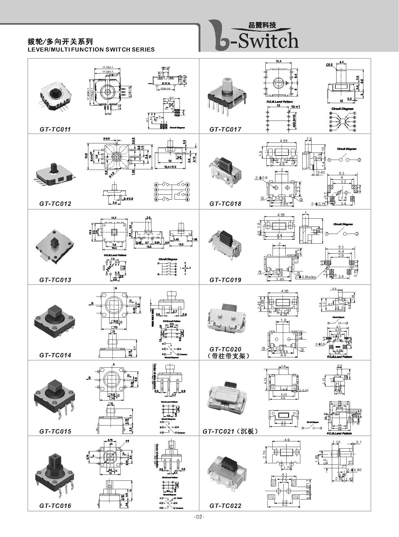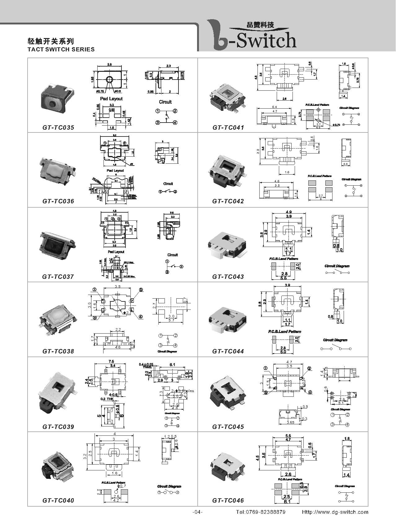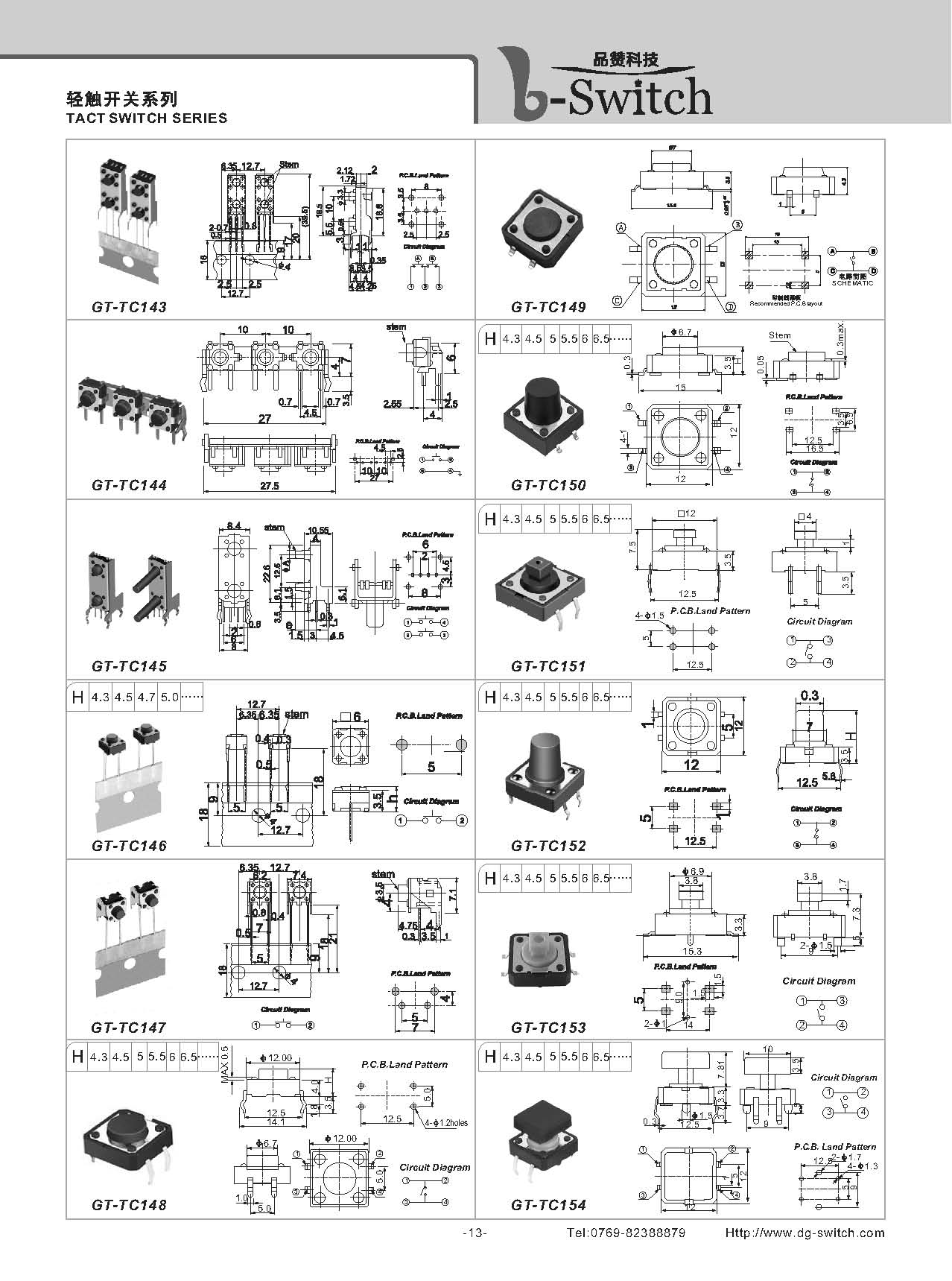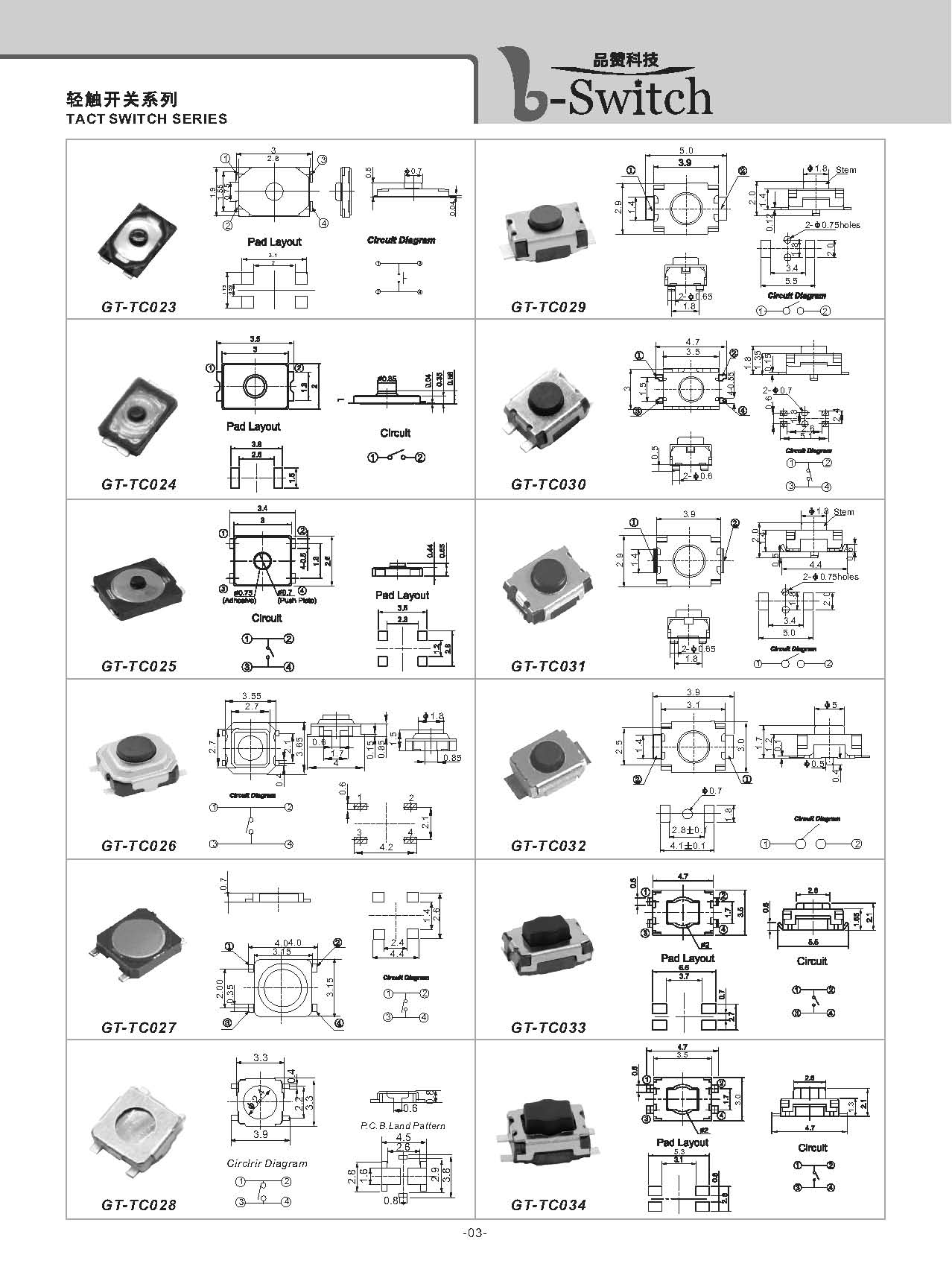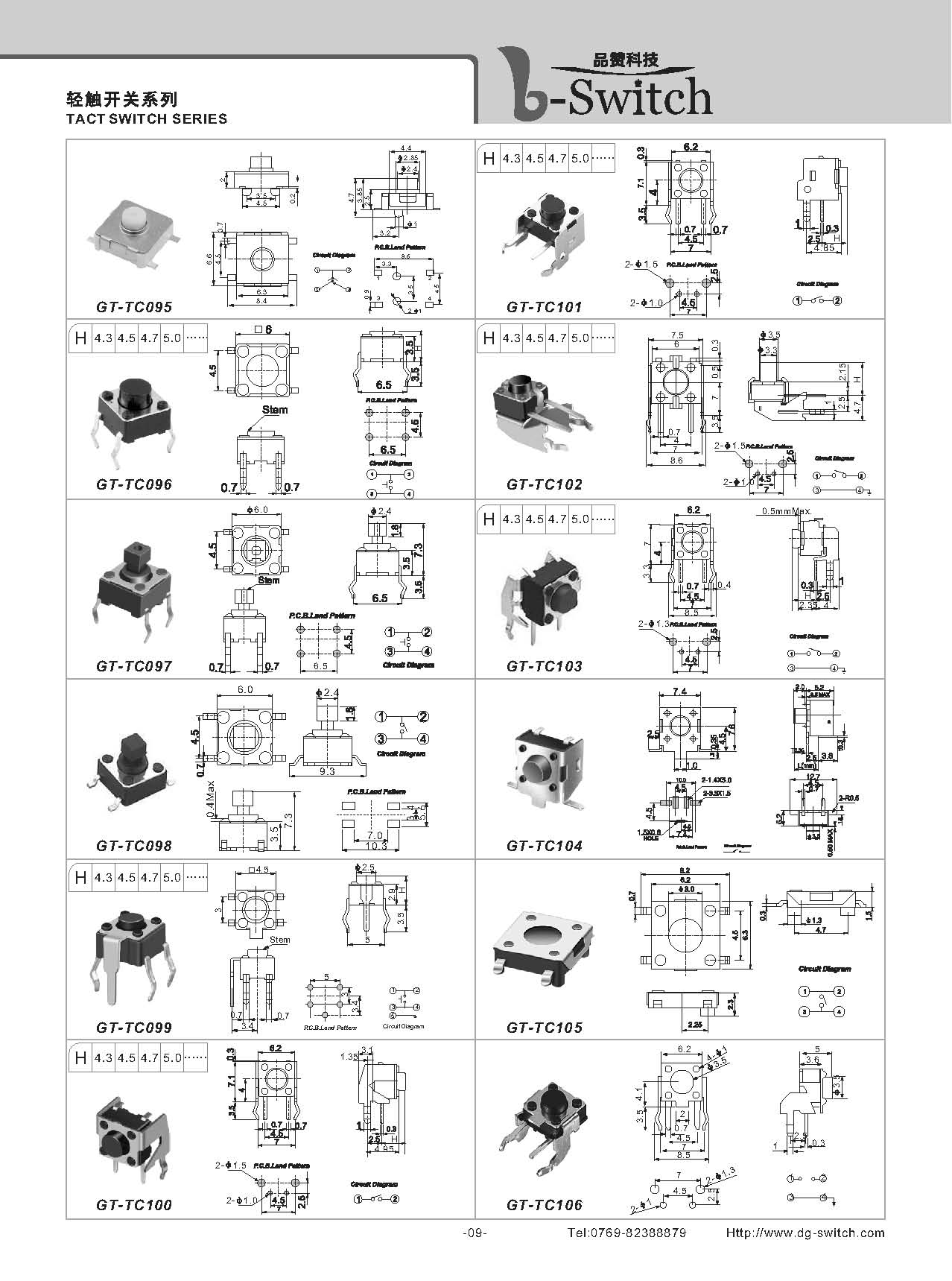 规格分类:轻触规格有:插件式、贴片式、侧按、沉板、防尘防水、带灯、带支架、乌龟型侧按。插件式的规格有:插件式3*6系列、插件式4.5*4.5系列、插件式6*6系列、插件式6.2*6.2系列、插件式8*8系列、插件式12*12轻触开关系列。柄高有:3.8、4.3、5、6、7.5-28mm不等,根据客户产品结构要求来定制。