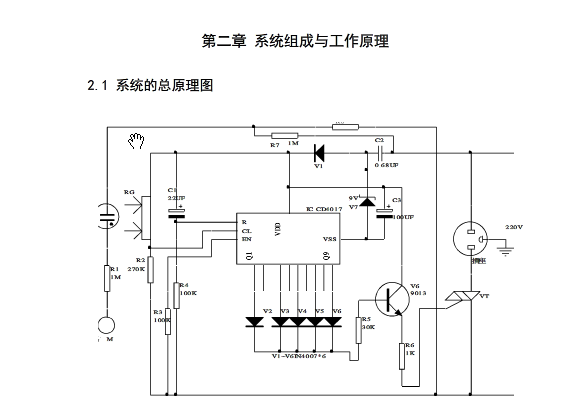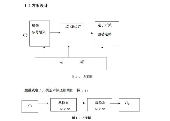 单键开关由轻按信号输入电路,IC CD4017信号处理电路,电子开关驱动电路及电源组成。由开关内部弹片把人体的轻按信号转化成同频的标准的MOS电平,然后输入IC4017d的十进制计数器信号处理,最后由ICCD4017处理后的结果决定是否驱动电子开关导通灯泡或者其它的使用设备工作图如下1-1。