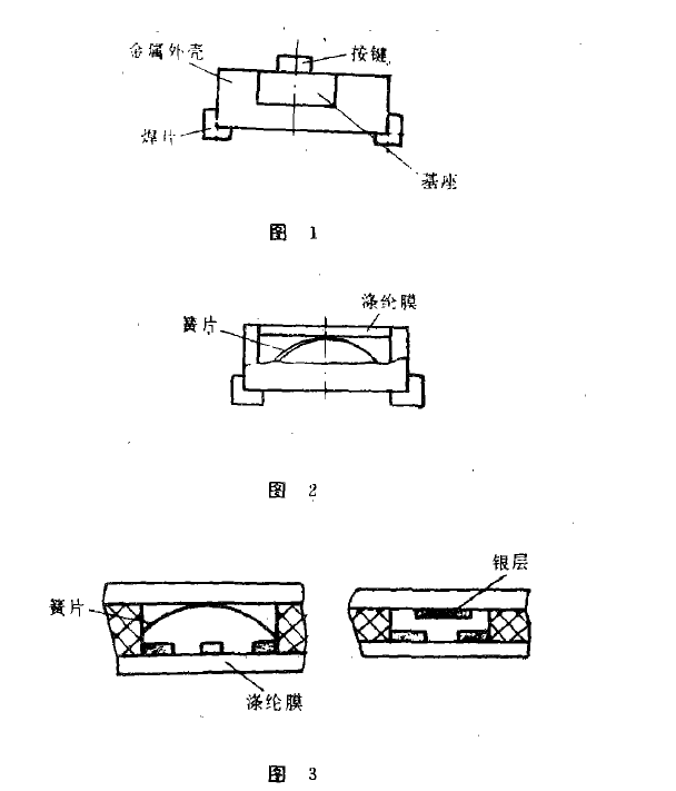 现在已有第五代开关——薄膜开关(也叫超薄轻触开关),功能与轻触开关相同,主要用于电子仪器和数控机床,但是电阻大、手感差。为了克服手感差的现象,也有在薄膜开关内部是用银层做的接触点,而是接触簧片。(图3)电阻大, 一般在10 0 一3 0 n。轻触开关的结构是靠按键向下移动,,使接触簧片或导电橡胶块接触焊片,形成通路。