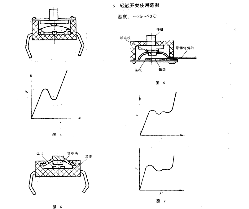 严格地说,,轻触开关分成两大类::利用金属簧片作为开关接触片的称轻触开关,,接触电阻小, 簇20 m n 。手感好, 有“ 滴答” 清脆声。利用导电橡胶作为接触通路的开关习惯称为导电橡胶开关。开关手感好, 但接触电阻大, 一般在10 0 一3 0 n。轻触开关的结构是靠按键向下移动,,使接触簧片或导电橡胶块接触焊片,形成通路。开关的操作力与簧片所处的状态有关( 图4 )。开始力与簧片的压缩的距离成正比, 当簧片压缩到5 。%一70 % 时, 操作力突然减少,,并伴有“ 滴答” 声。导龟橡胶开关一般有两种结构灯图5 、图右, 一操作力曲线随橡胶块的几何形状不同而有很大的差异。图5 的橡胶块的操作力曲线与图4 相同,,但图6 的橡胶块的操作力曲线与图4 有很大差别(图7 )。相对湿度:≤95%;额定电压:1 2 V;额定电流:50 m A;使用范围:彩色电视机、黑白电视机、音响设备、像机、摄像机、话机、对讲机、计算机、游戏机、传真机、警棍、机床控制装置、复印、打印机、电子仪器、器机 仪表和其它家用电器。操作力度有:70gf、100gf、120gf、160gf、180gf、200gf、250gf、300gf、350gf、400gf。