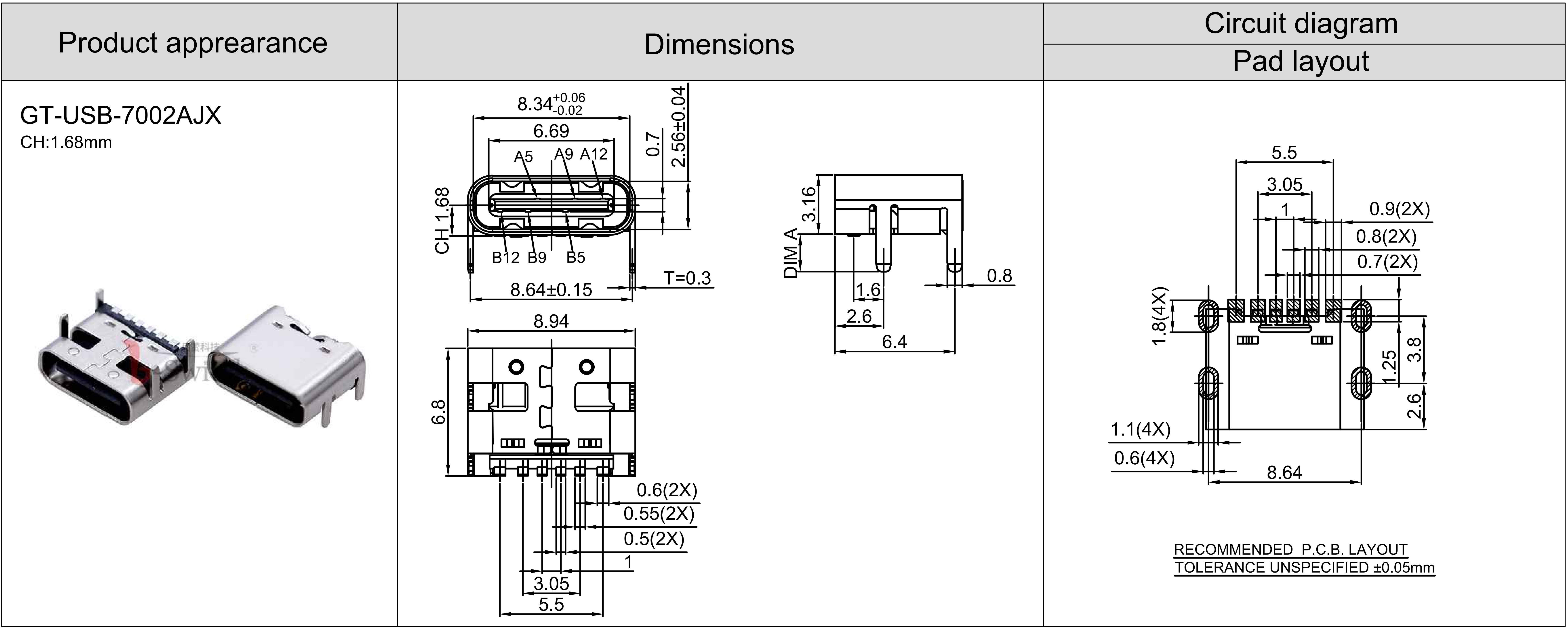 Type c 6PIN:全贴款/四脚插板款;L6.5/6.8mm;VBUS部分可实现5A电流,外壳有带弹与无弹款。