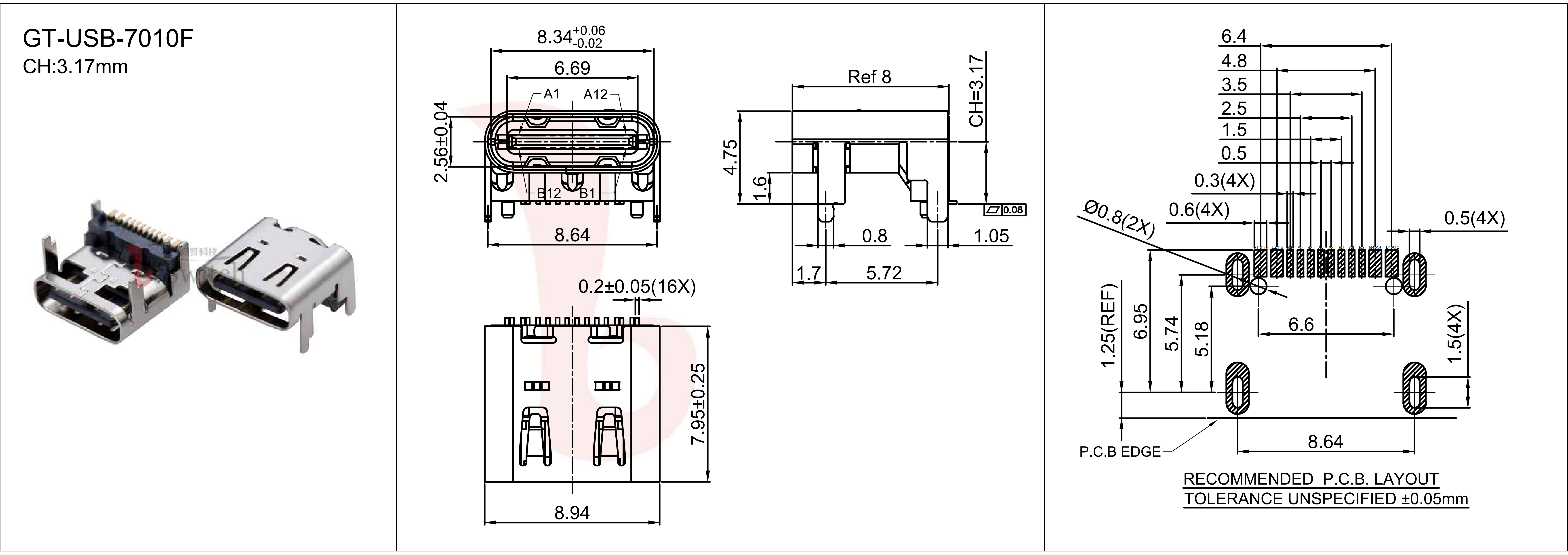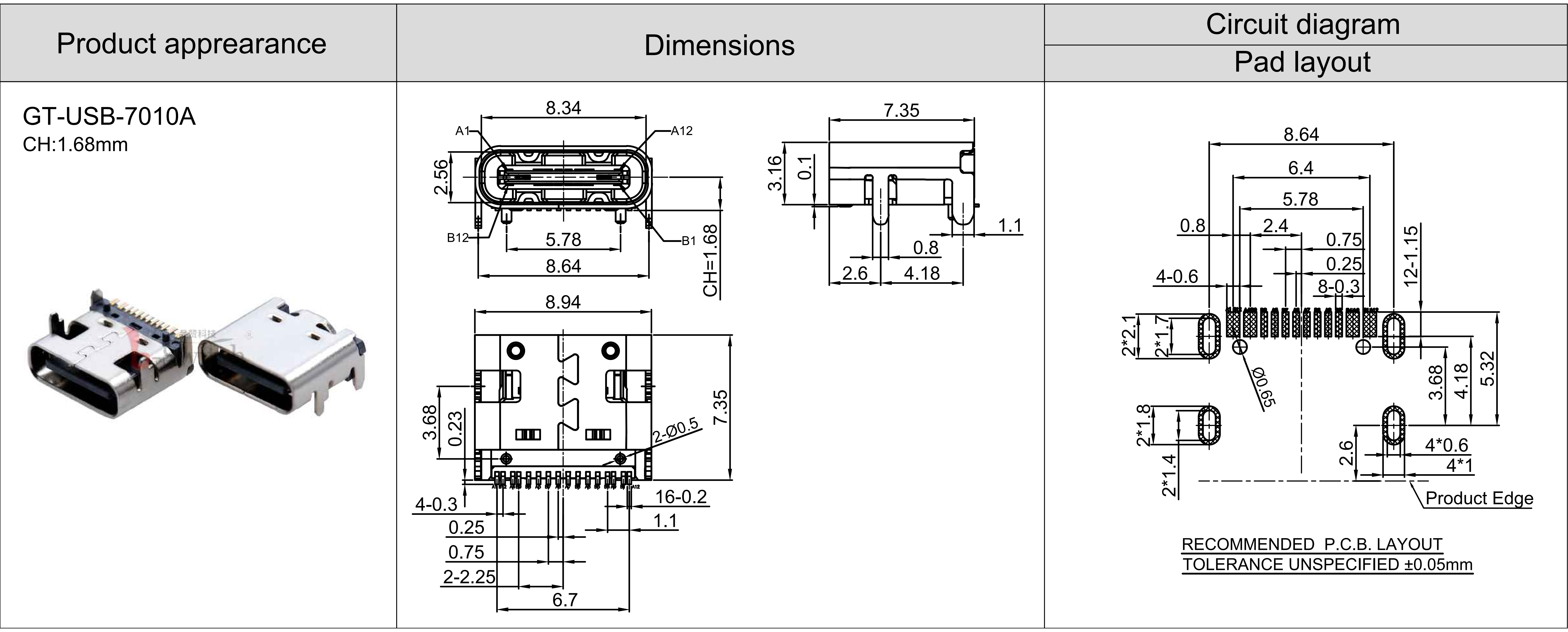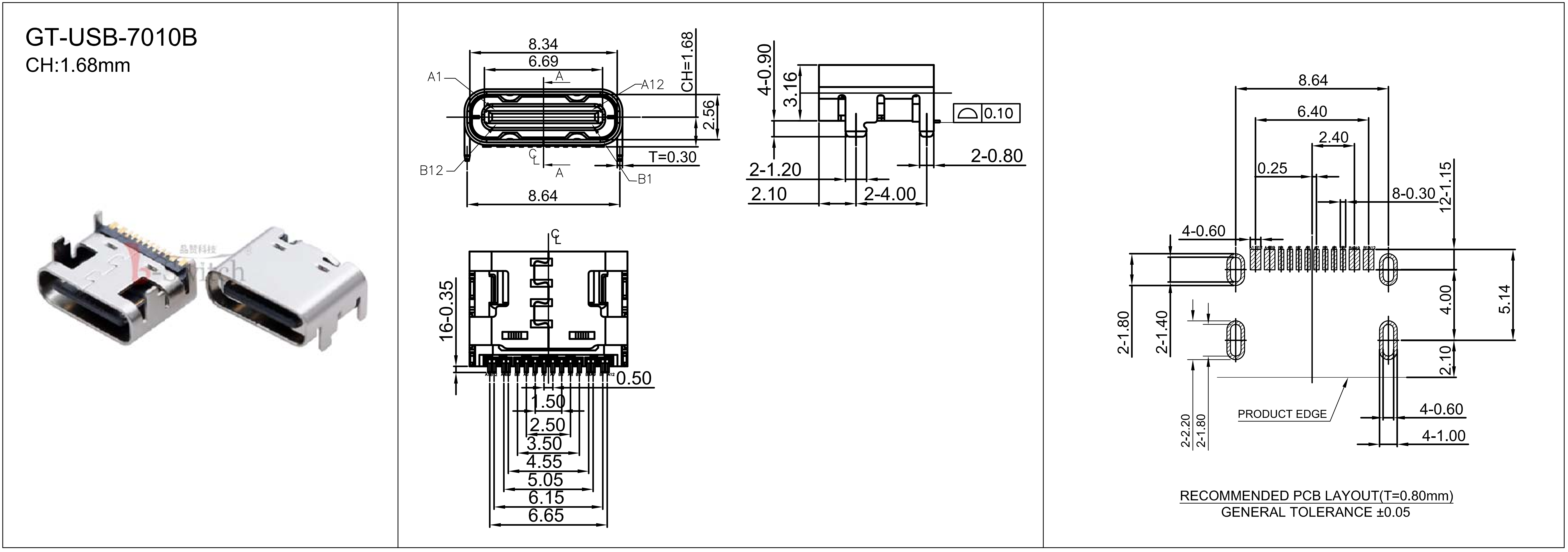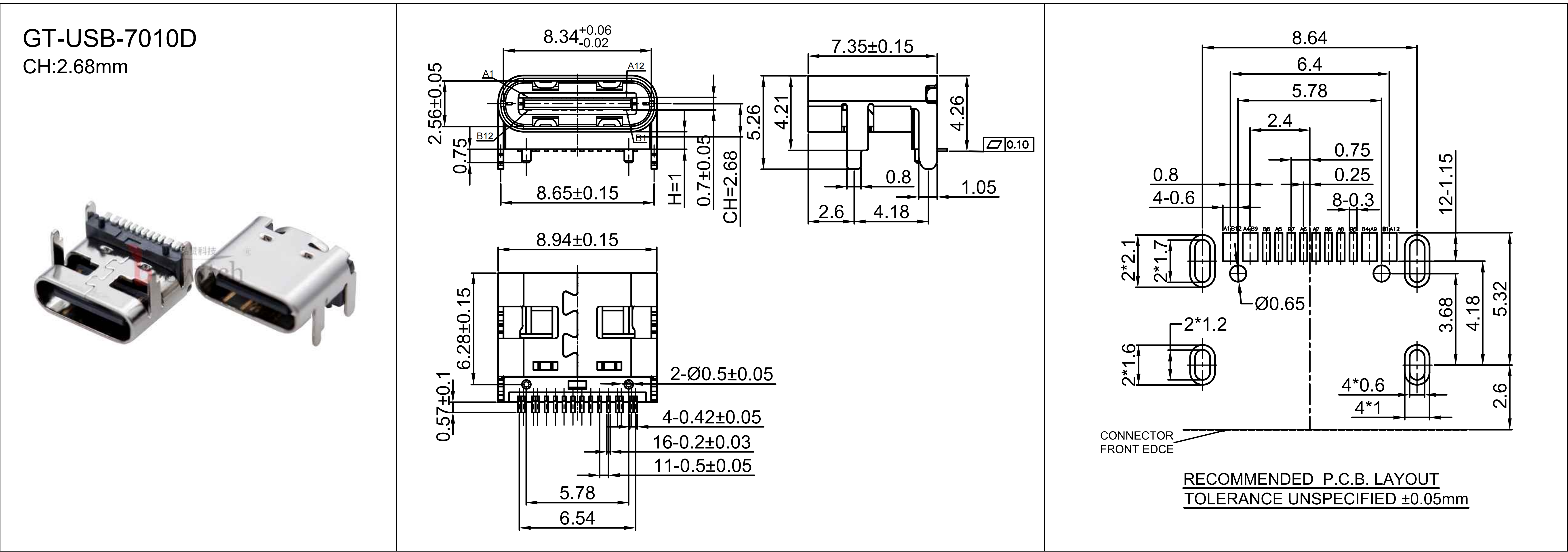 USB协会TID:7341,外壳长度L6.5、7.35;加高0.5/1.0/1.5,CH1.63、CH1.68、CH2.68、CH3.18mm;外壳有有弹/无弹,无柱带柱款;电流3A、5A、8A;插拔寿命一万次。