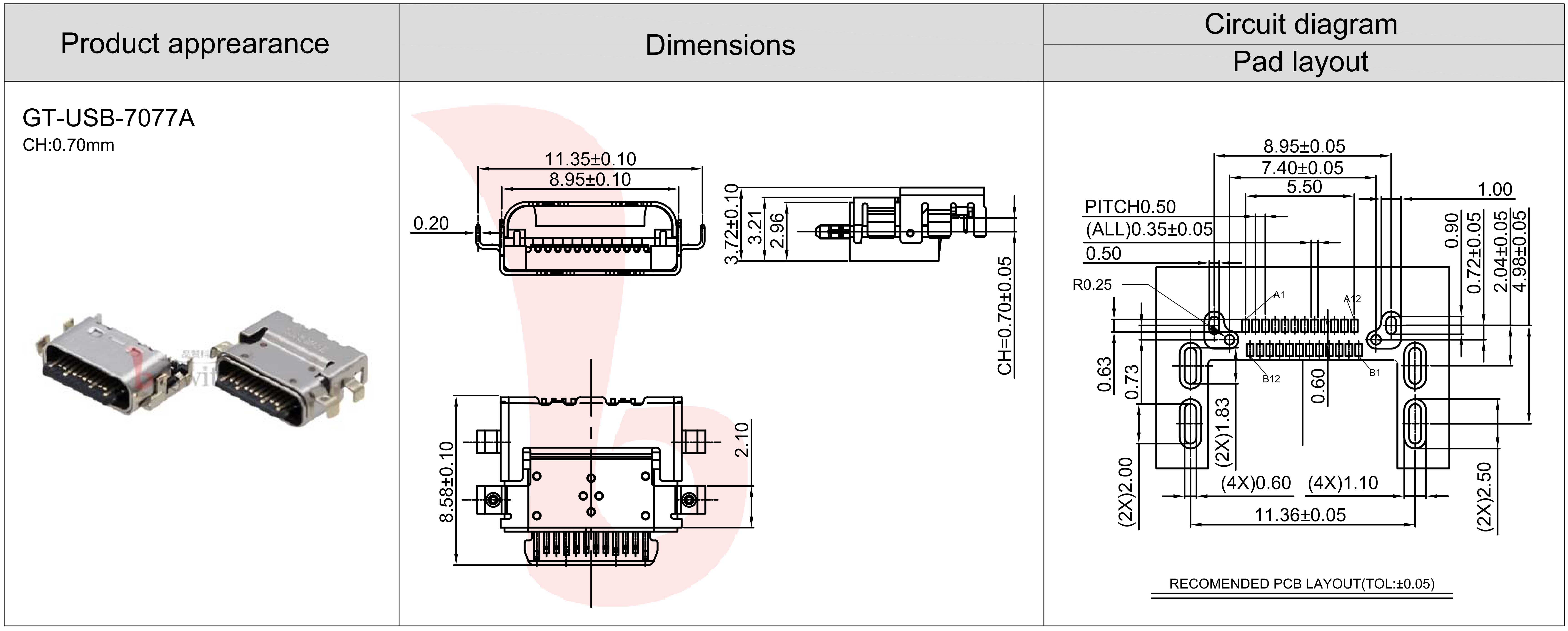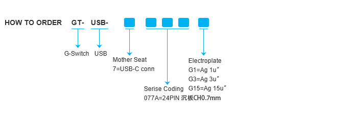 沉板24PIN TYPE-C母座 CH0.7mm,额定电流3A,插板寿命10000次。