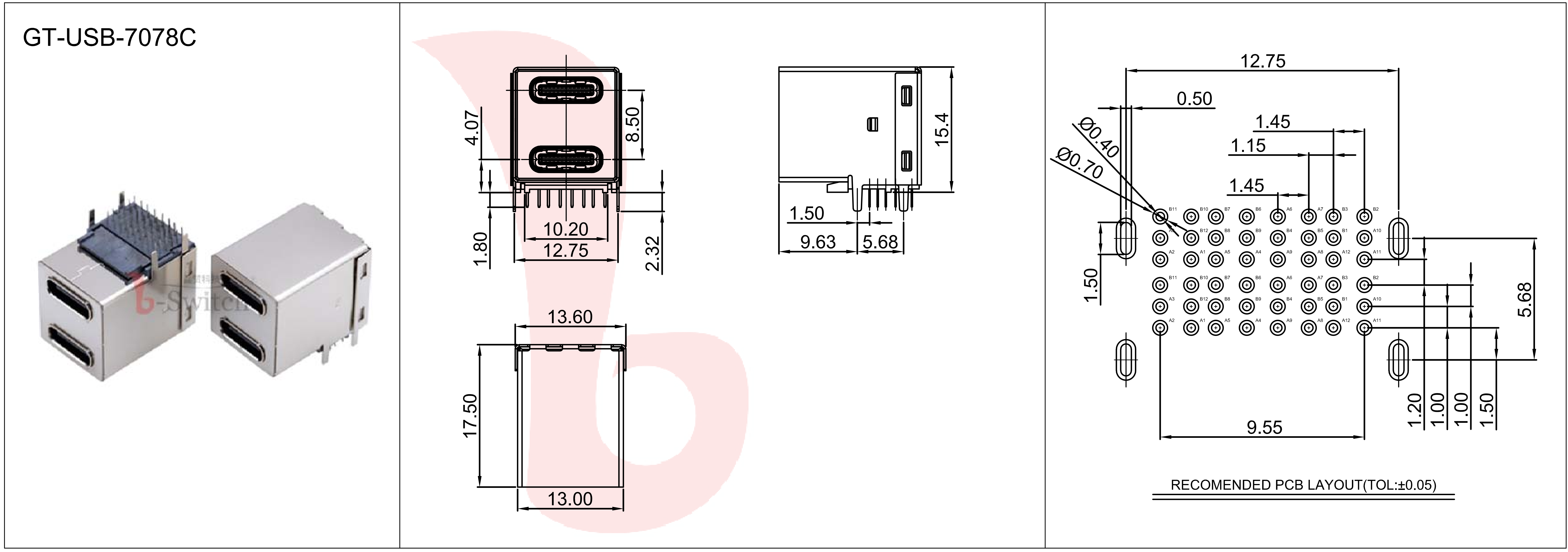 双层TYPE-C母座分为:16PIN/24PIN两款,外形可分有卷边或无边可选,因结构特殊性目前只能达到普通传输标准。