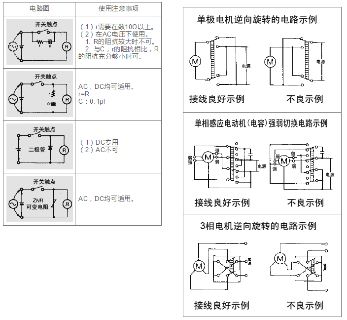 旋转过程中使其逆向旋转的情况下,流过的电流是启动电流的约2倍。另外,用于会发生过渡现象的负载时,如电机逆向旋转操作、或者异极切换等,因时滞的影响,切换时的极间可能会发生电弧短路(电路短路)。使用时敬请注意。