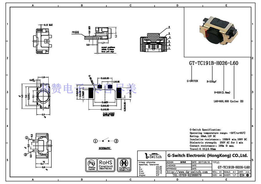 轻触开关生产厂家,我们有必须带着这个行业不断的更新进步,不断的突破自己,改进自己,才能不断的在进步。今天我们要介绍的就是左图中的产品,该款产品的长宽为:2.2×4.5mm,高度为2.6mm,沉板高度为0.6mm;更为可怕的是该款产品寿命高达600,000次,是的你绝对没有看错,这么小的一款侧按轻触开关我们做到的寿命不是10W次是而是60W次,没错我们品赞电子就是超乎你的想象。该产品的应用范围:手机、平板、耳机、FPC软板、数码产品等电子产品。