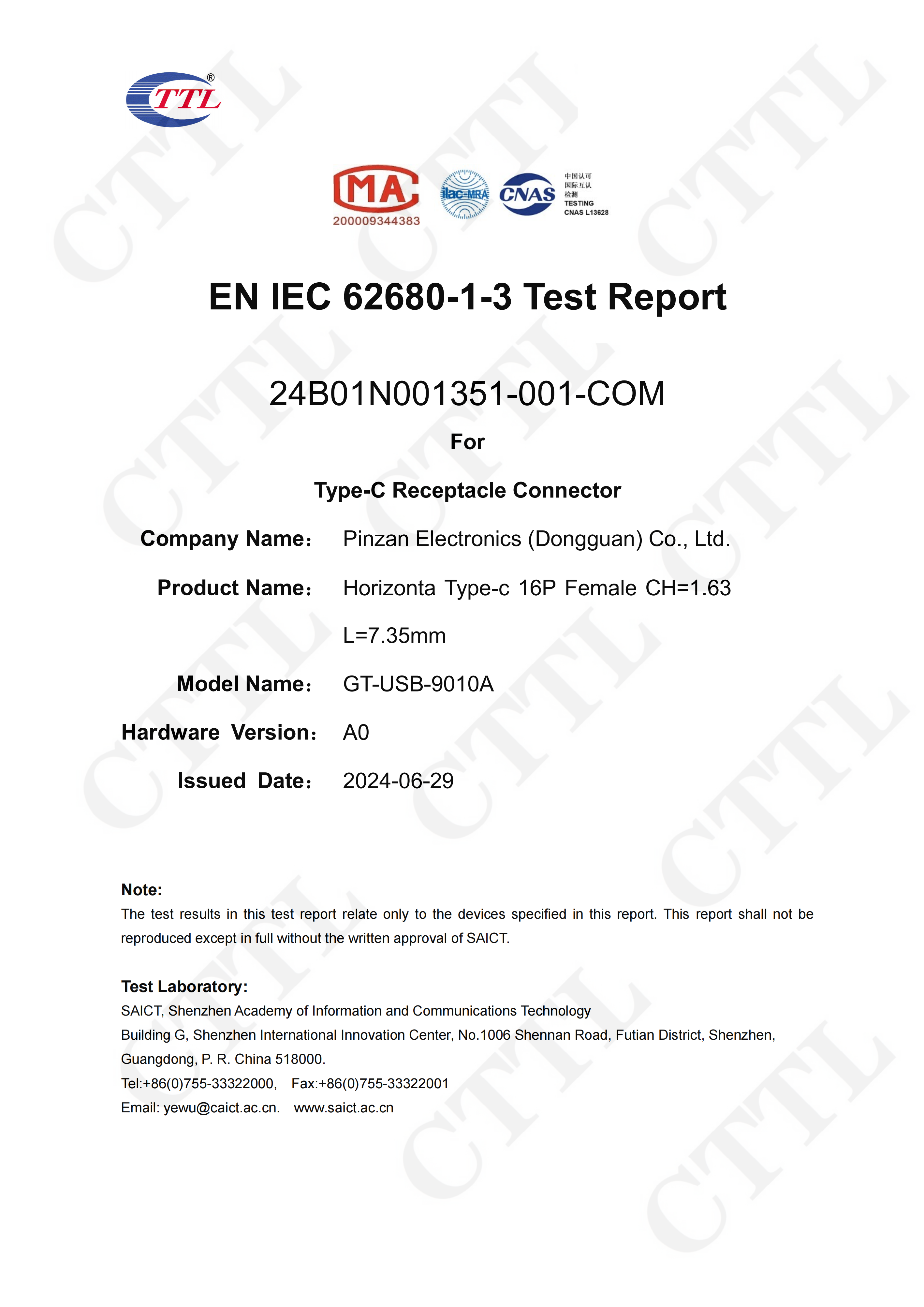 截止2024年7月10号,品赞有将近20款产品取得TID认证以及测试报告,有一款取得62680-1-3的测试报告;另外还有10款在测试中,陆续会有报告出来。符合两种测试的款式有一百多,可以根据客户的要求与选择来增加测试报告,如果需要提供测试报告的客户可以与我们业务取得联系,我们会尽量满足客户的要求去获得报告。
