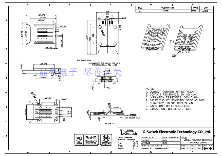 相关的材料,电镀等信息请参照皓威的产品图面;焊接件需满足无铅焊接要求,产品需符合RoHS标准。