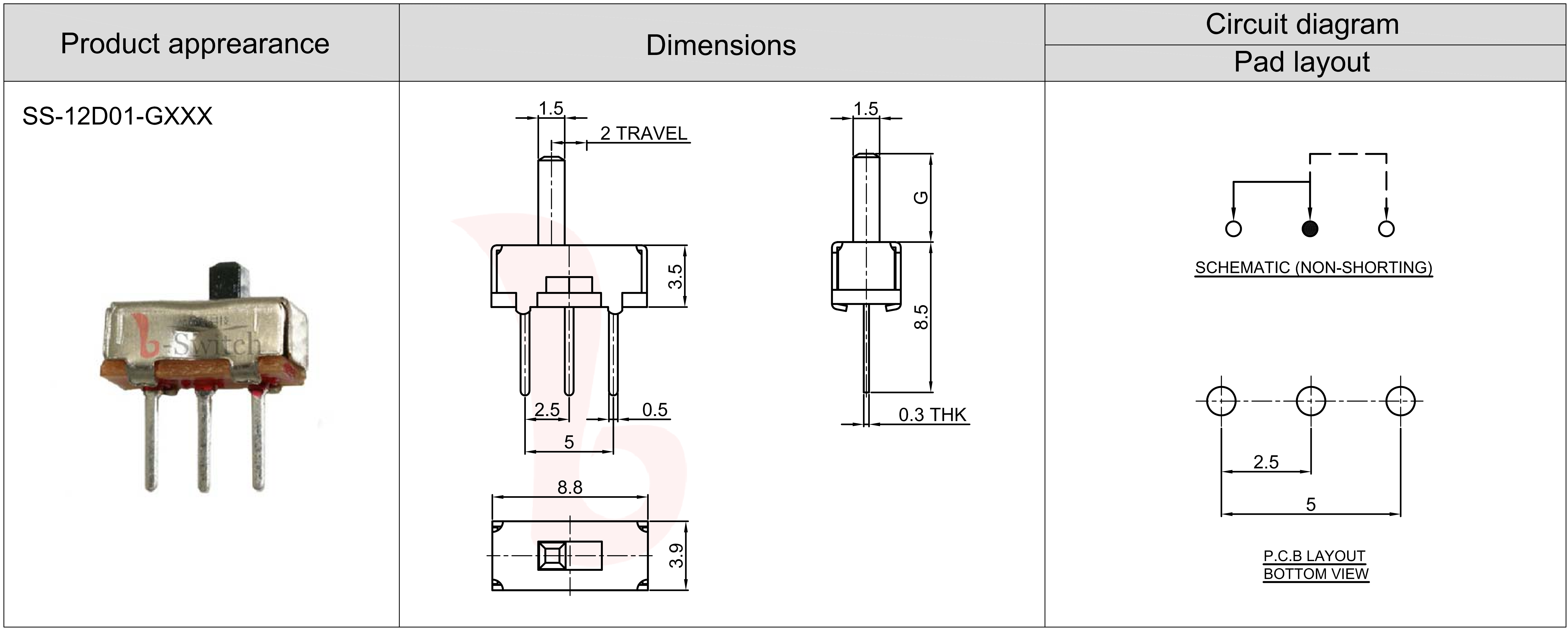 直滑1P2T拨动开关SS-12D01,柄长可定制1.0-10.0mm,手感好,寿命长等特点。
