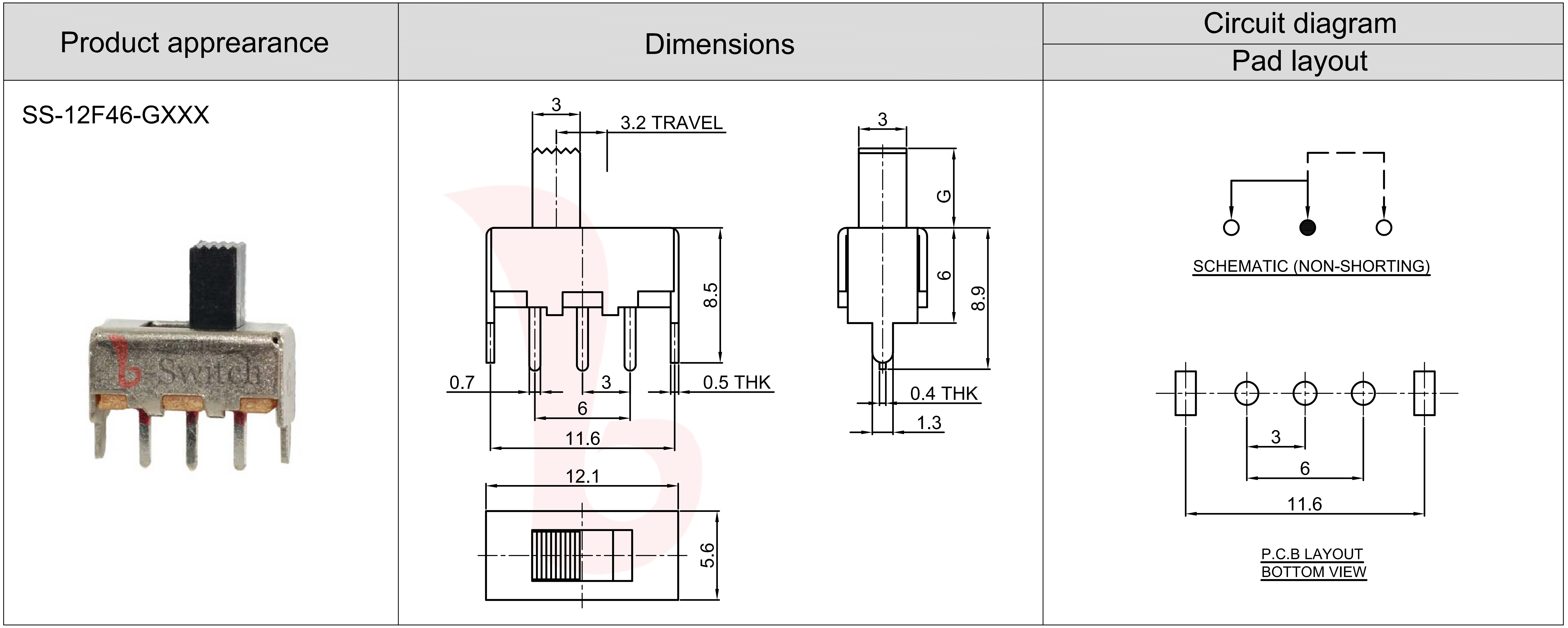 带固定脚1P2T拨动开关SS-12F46,柄长0-10.0mm,手感好,寿命长,耐高温。