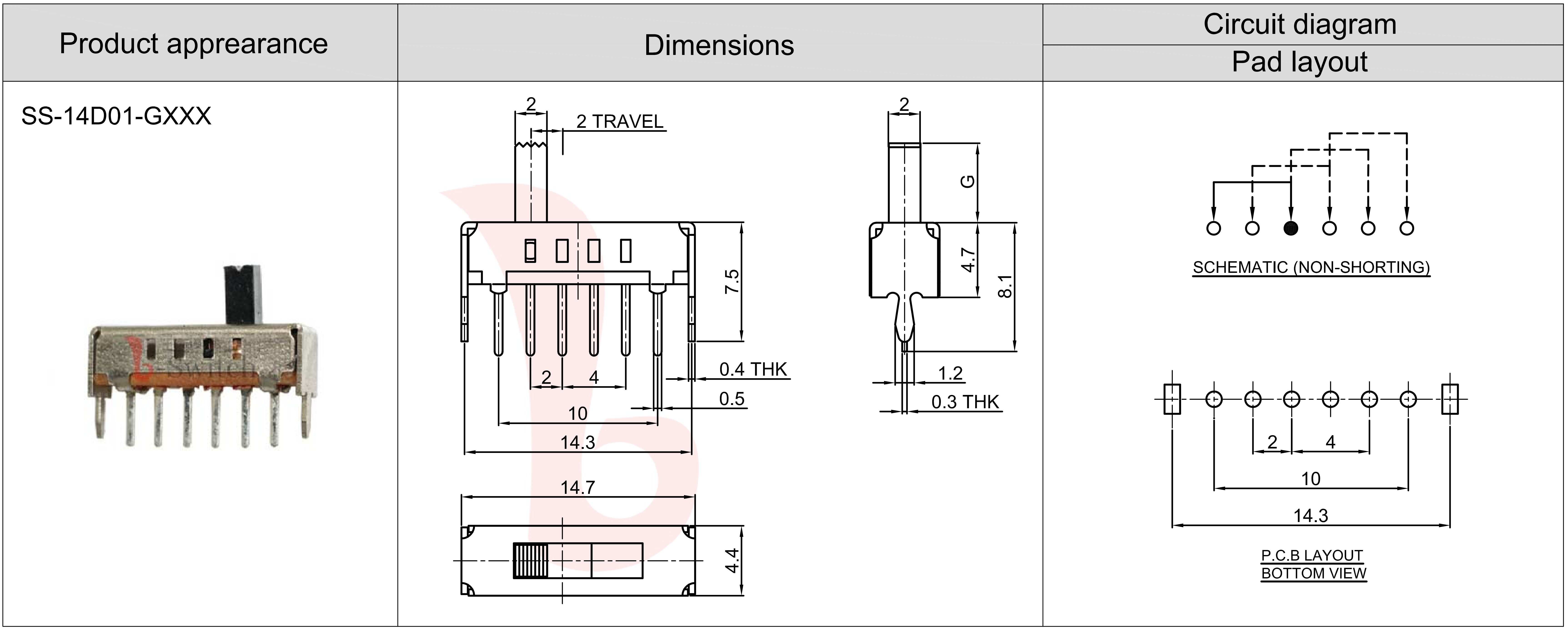 1P4T拨动开关SS-14D01,柄长0-10.0mm,手感好,寿命长,耐高温。