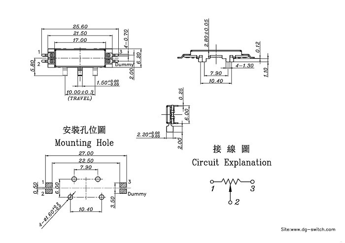 全阻抗值 Total resistance:500Ω-1MΩ 滑柄止档强度 Lever stop strength :1.0kg Min at 10 Sec